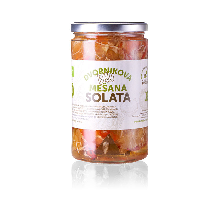 Dieser gemischte Salat vom Bio-Bauernhof Dvornik wird von uns mit Liebe und Hingabe hergestellt. Direkt aus dem eigenen Garten, bietet dieser Salat den reinen Geschmack von frisch angebautem und sorgfältig verarbeitetem Gemüse. Oft reicht schon eine Scheibe selbstgebackenes Brot, um diesen Salat zu genießen – er ist ein echter Genuss! Verfeinert mit den eigenen Gewürzen des Bauernhofs, kommt der natürliche Geschmack der Zutaten perfekt zur Geltung.
