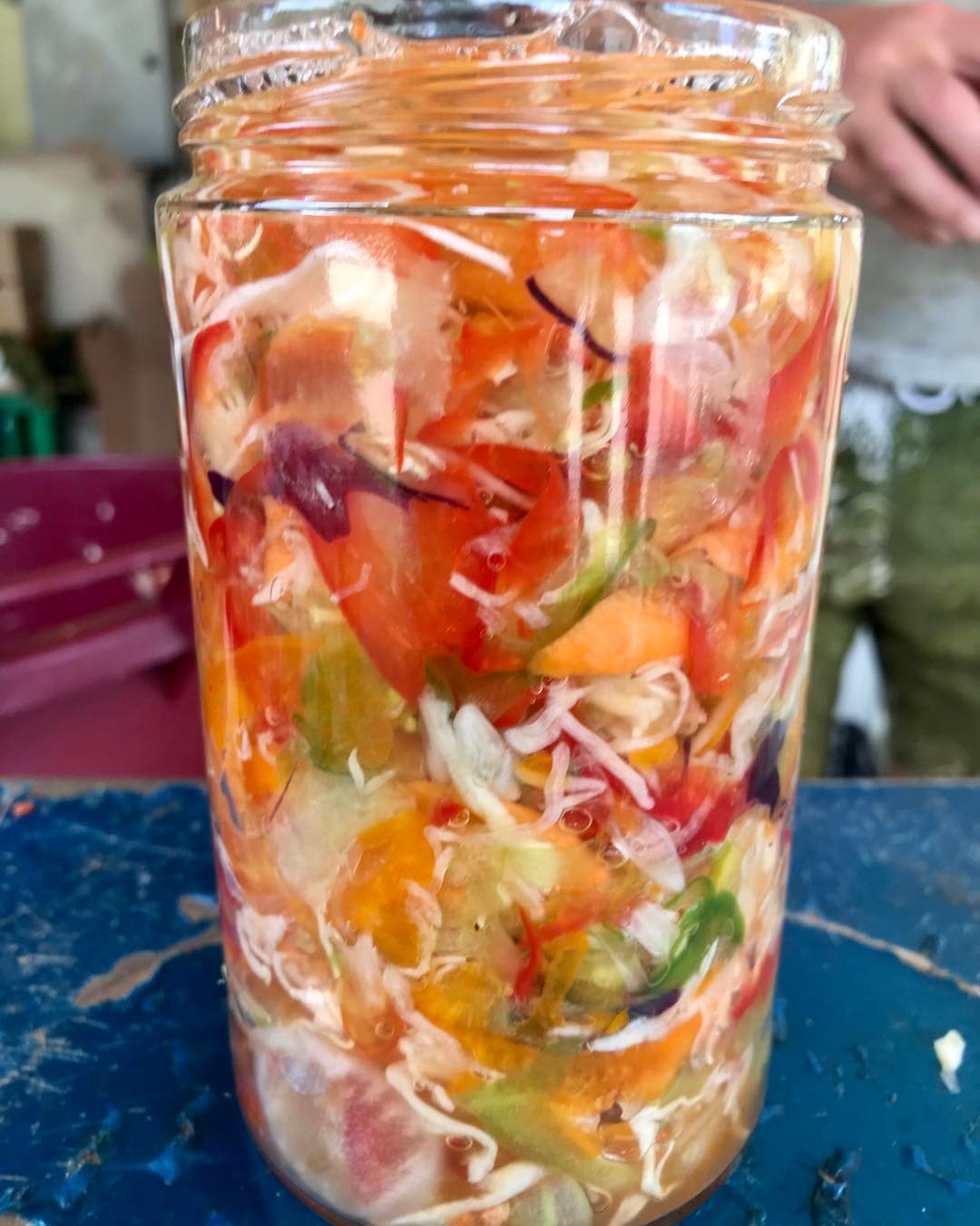 Gemüse aus eigenem Anbau und unserem Garten: Bio-Tomaten* (12,3%), Bio-Paprika* (12,3%), Bio-Möhren* (12,3%), Bio-Zwiebeln* (12,3%), Bio-Kohl* (12,3%), Bio-Knoblauch* (3,23%), Wasser, Bio-Essig* (6,5%), Bio-Rohrzucker* (1,62%), Piran Meersalz* (1,3%), Bio-Lorbeerblatt* (0,005%), Bio-Pfefferkörner* (0,005%).