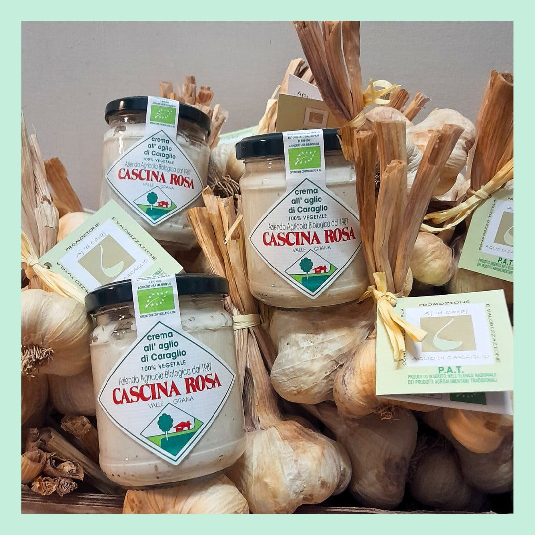 Caraglio, an den Hängen des Tals, ist die Heimat eines berühmten Knoblauchs. Daraus wird diese verlockende, streichfähige Creme hergestellt, die überraschend leicht und zart ist und sich gut für die verschiedensten Kombinationen eignet: von Fleisch zu Gemüse, von Fisch zu Käse oder einfach auf eine Scheibe Brot gestrichen.